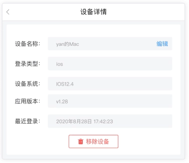 (3)选择并点击其中一个设备,随即进入设备详情页面。在该页面底部找到并点击“移除设备”按钮,确认移除操作后,该设备已登录账号的相关密码缓存都将被清除。