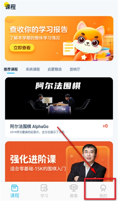 1、接着安装聂卫平少儿围棋,登录账号,完成学习或者测试之后,在主页右下方点击【我的】