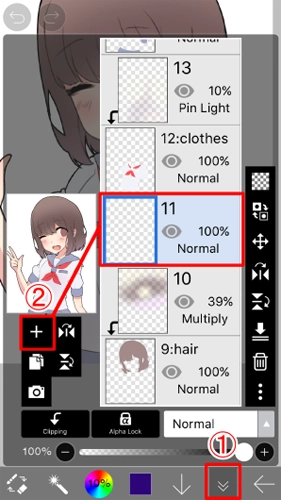 同样, 点击加号按钮在 "图层" 窗口中, 为阴影添加图层, 使其成为当前图层, 并将③混合模式 "乘法"并最终转到步骤四剪切on。另外, 将画笔颜色更改为黑色。