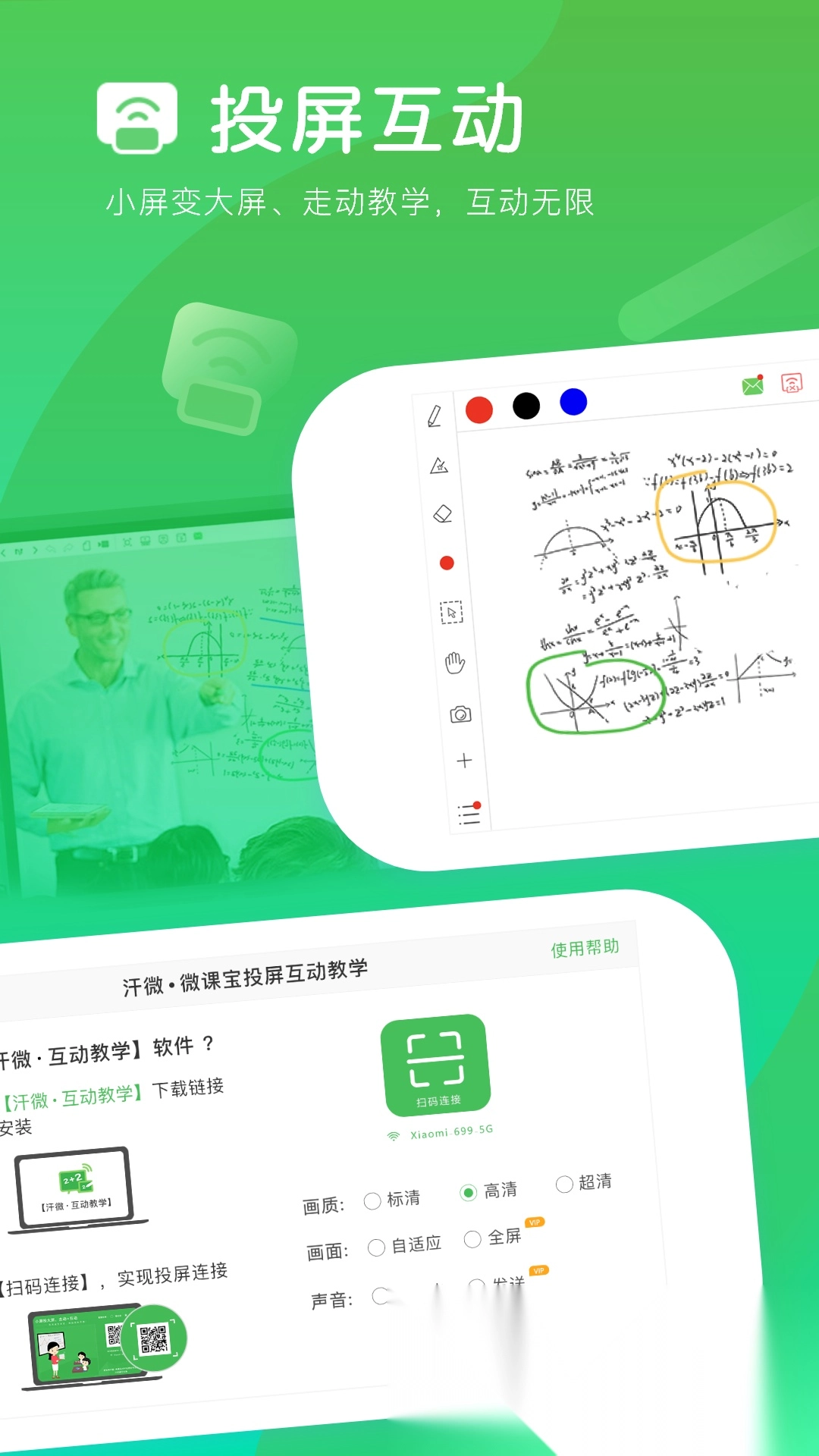 汗微微课宝是一款便于师生课堂使用的软件,具备“微课录制”“在线直播教学”“课堂投屏互动教学”等多样功能,能助力老师轻松开展走动教学,也方便学生录制下实时讲解、板书、课件、试题解析等重点内容,为后续复习提供了便利。