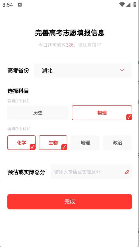 进入首页后,先选择高考身份、科目和高考总分,再点击“完成”按钮。