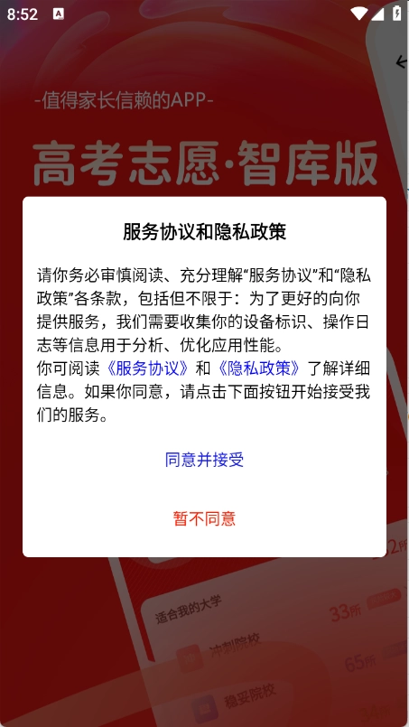 启动高考志愿智库版应用后,需先对隐私政策和用户协议进行确认并同意。