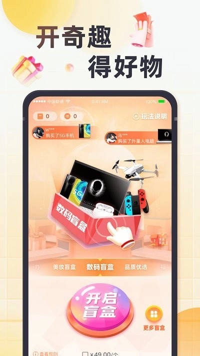 奇趣盲盒是一款实用的线上盲盒购物应用,平台上的盲盒涵盖美妆、数码、周边等丰富品类,你可以通过清晰的分类专区挑选心仪盲盒进行抽取和购买,抽中物品的概率很高,但想获得目标商品则需要更多运气加持。平台会根据你的偏好每日推送热门精选盲盒,助你参与活动领福利,更划算地入手心仪好物。感兴趣的朋友可别错过啦。