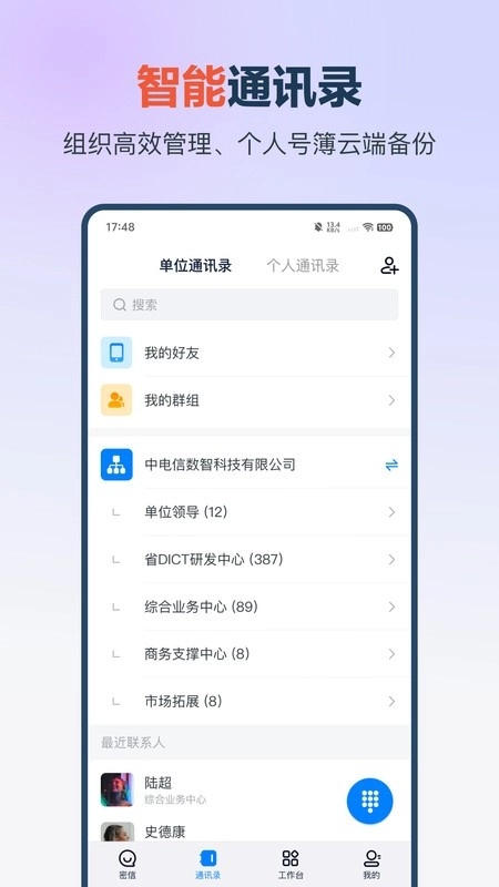 智能通讯录功能:可实现组织通讯录的统一化管理,能便捷地快速查找同事信息,同时支持部门架构的清晰展示。
