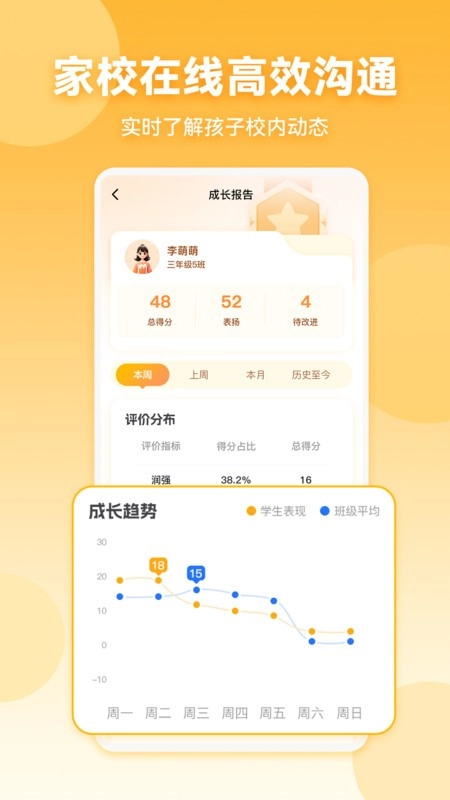 支持从学业表现、课堂参与度、课外活动、品德修养等多个维度对学生进行评价,并以图表形式直观展示学生的成长变化,帮助家长了解孩子的全面发展情况。