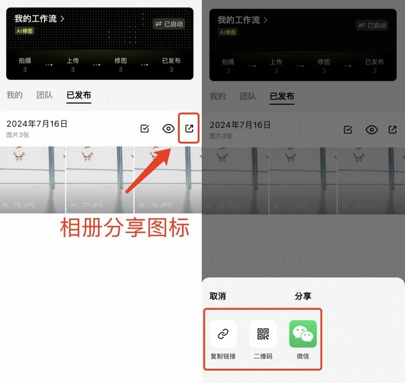 完成照片拍摄后,前往已发布内容的界面,点击发布相关的图标,即可看到复制链接、生成二维码、分享至微信这三种不同的分享途径。