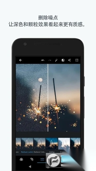 可通过调节清晰度、对比度、曝光度、高光、阴影、色温、色调及自然饱和度的滑动条来调整画面;此外,还能借助黑色、白色、降低明亮度、减少杂色等多种校正功能,让图像达到理想状态。
