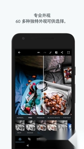 效果:拥有超45种吸睛效果!涵盖黑白、纵向、自然、双色调等多种效果类别