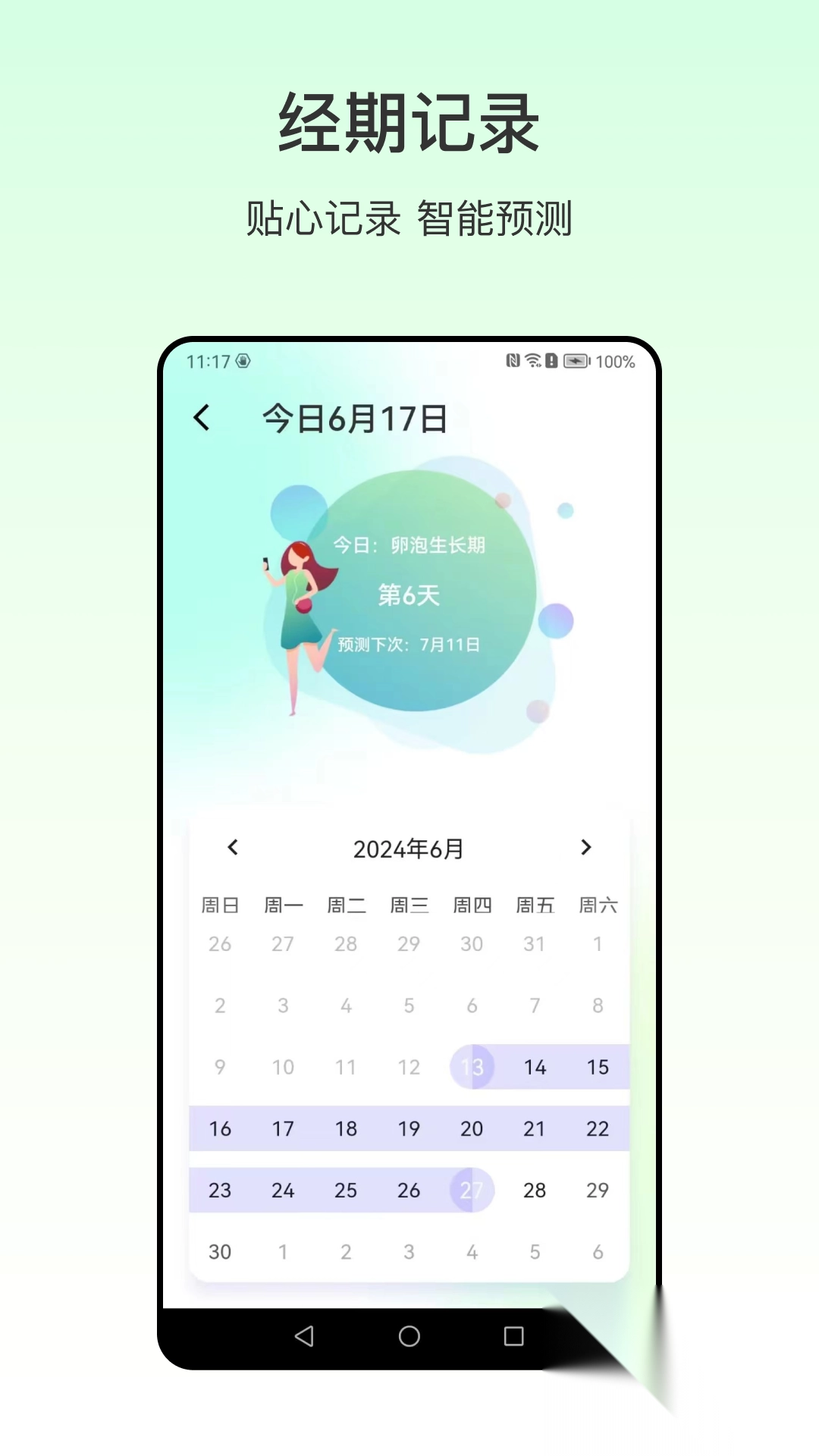 可以轻松管理生理期相关情况,自动生成专属的周期日程表,还能通过智能算法预估下一次生理期和易受孕时段,让你简单便捷地了解自己的身体节律。