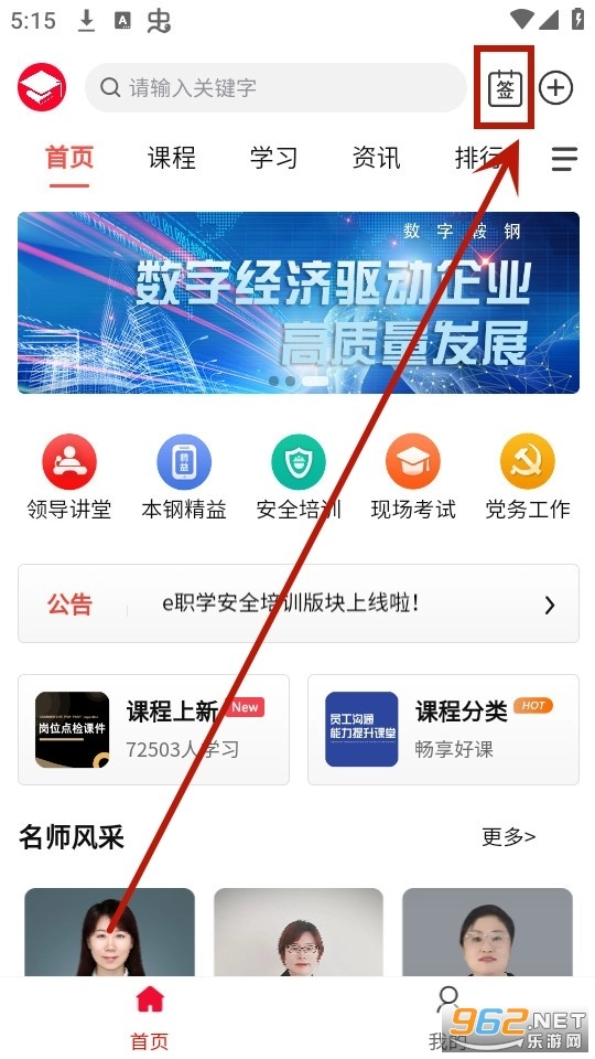 先安装好e职学并打开它,接着找到界面右上方标有【签】字的按钮,点击这个按钮就能完成签到操作啦。