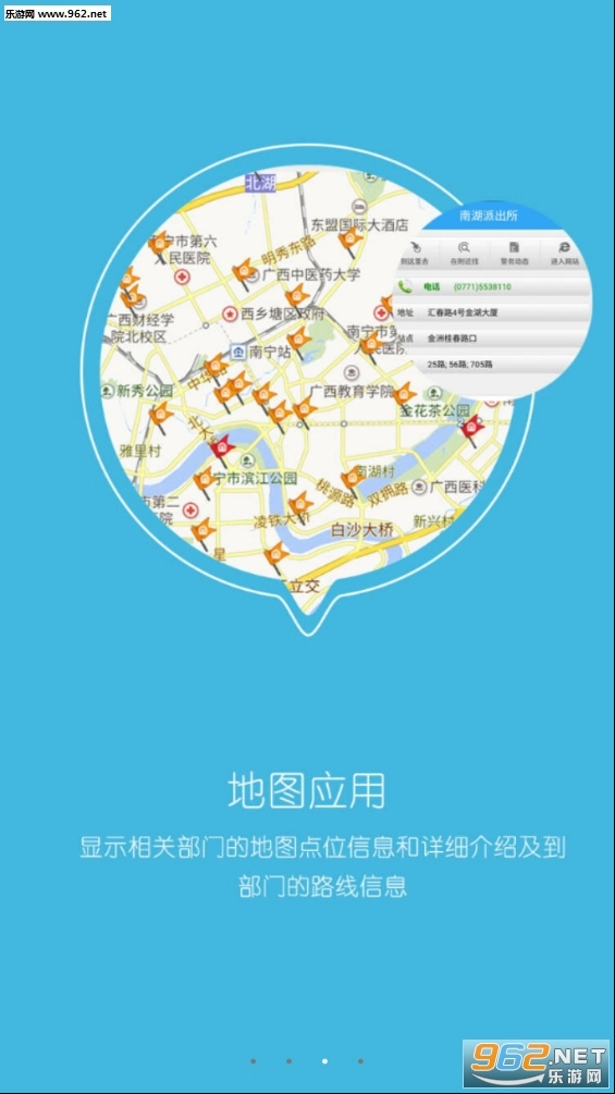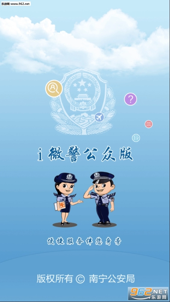 “i微警公众版”由南宁市公安局版权所有。这款客户端主要涵盖办事服务、查询服务、地图应用、警务资讯、安全防范、求助咨询、违法举报、公安微博等功能模块。