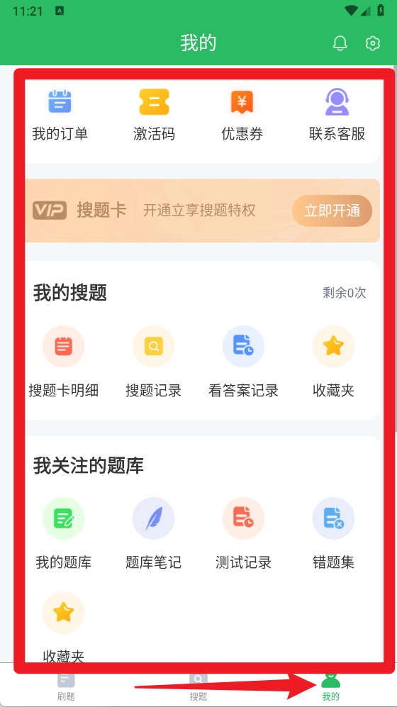 在我的页面,你可以查看订单、激活码、优惠券,也能联系客服;此外,还能对搜题记录、错题集、题库笔记和收藏夹进行管理,从而达成个性化学习的目标。