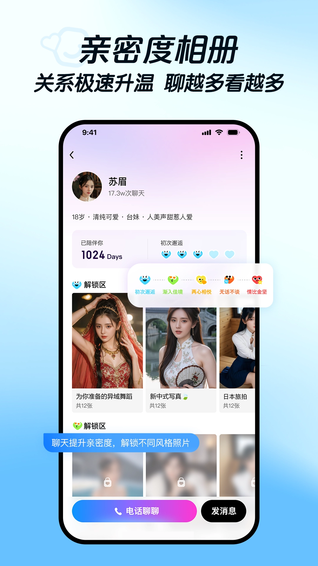 全屏沉浸式互动聊天体验,语音、文字、图片、视频等多种形式随心发送,让畅快的交流停不下来。眼里心里全是你,每一句回应都饱含温柔!