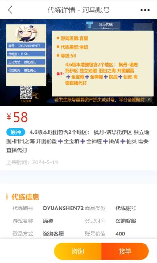 这里呈现了代练的详细信息,所有关于代练的具体内容都能在此查看,您可以随时咨询代练相关事宜。