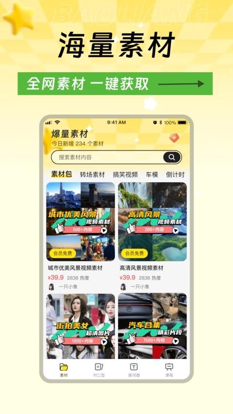 爆量素材最新版是一款拥有海量高清短视频素材资源的应用软件,用户能借助它轻松获取各类优质视频素材,用于开展心仪的视频制作与推广工作,操作十分便捷;此外,软件还配备了智能提词器工具,助力用户轻松摆脱记不住台词的困扰,只需看着台词朗读,就能便捷完成各类视频配音录制任务。不仅如此,爆量素材手机版内还收录了丰富的短视频课程,用户可自由选择学习,快速掌握各类爆款视频的制作技巧,让自己创作的视频收获更多流量。有需求的用户赶紧在本站体验吧!
