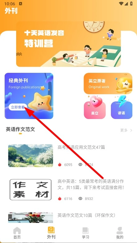在外刊页面,点击经典外刊板块中的立即查看按钮。