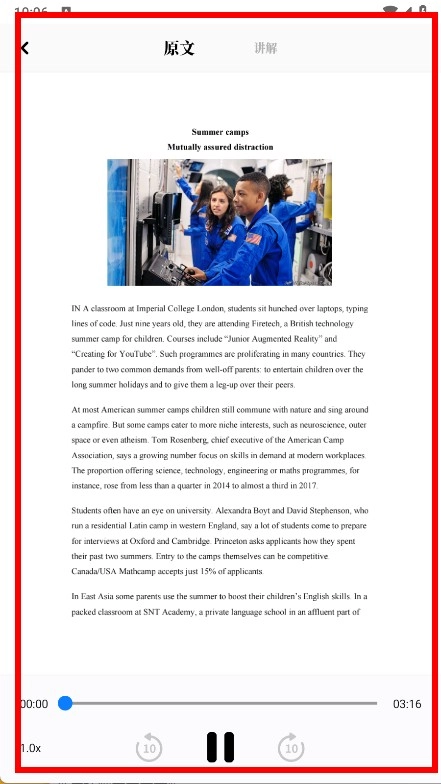 进入这篇外刊文章的详情页面,就能查看原文等内容并进行播放。