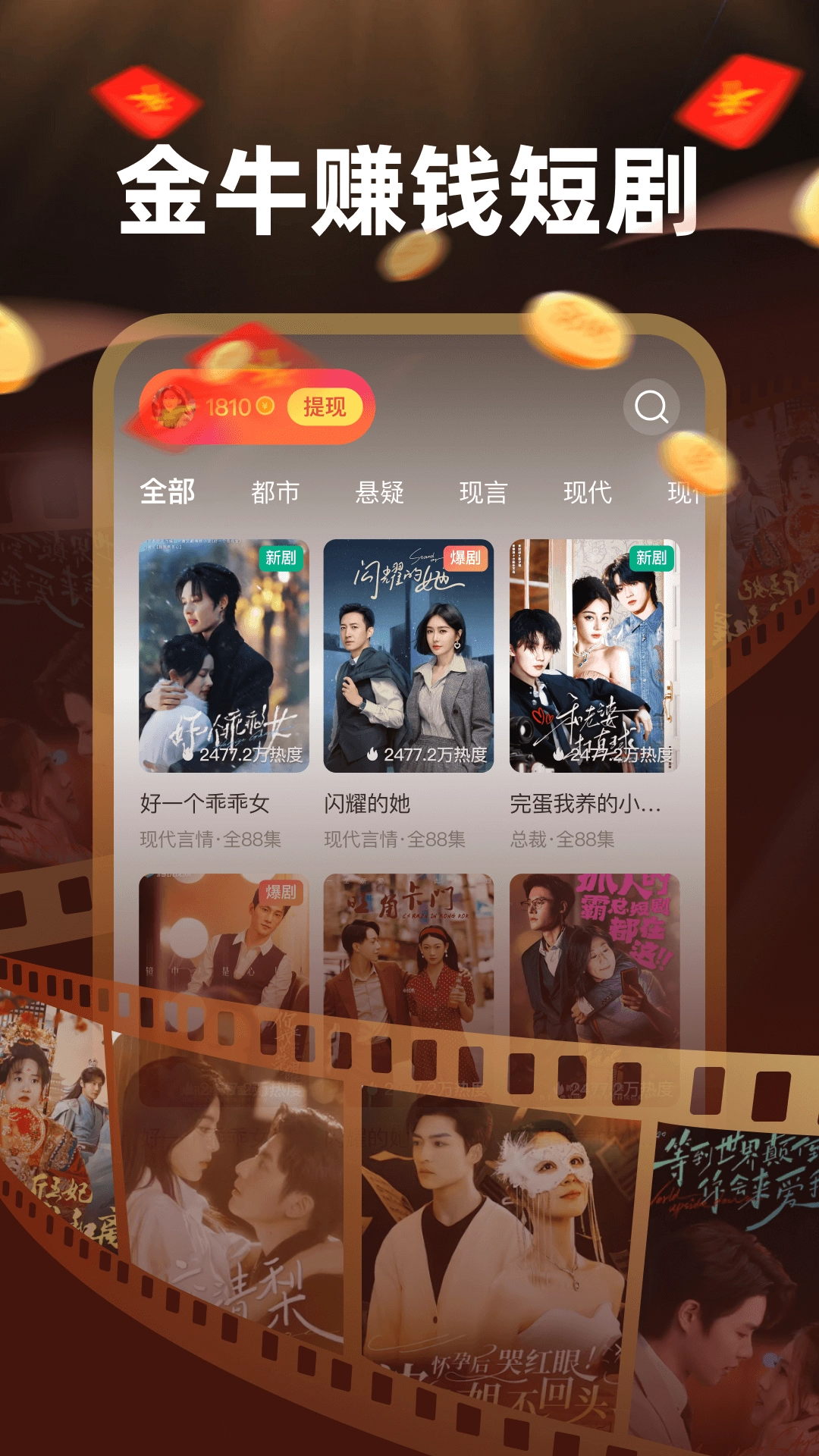 金牛赚钱短剧是一款能让你边看短剧边赚钱的平台,平台上有大量精彩短剧持续快速更新,你可以自由挑选心仪的短剧观看,还能根据喜好选择不同的播放模式,享受高清播放带来的流畅体验。观看过程中全程干扰,让你能轻松沉浸在喜欢的短剧内容里,无论何时想观看,都能直接打开尽情欣赏。