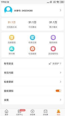 米赚作为国内较早开启网赚功能的服务平台之一,用户进入首页便能看到各类赚取“大米”的项目,像新手任务里的试用、绑定手机号,或是在第三方平台帮其他用户助力等。平台内设有多样的网赚任务,能轻松满足您通过手机在线赚钱的需求。另外,您还可以参与调研问卷来提升账户等级,这样更方便参与收益更高的进阶任务,期待您的使用。