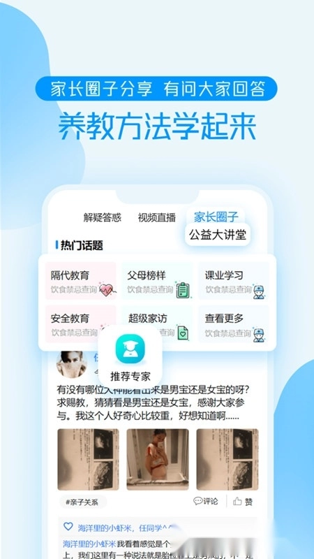 其中会有家庭教育讲座直播,专家咨询,课程学习等等不同的功能。