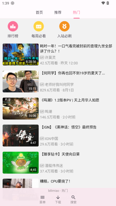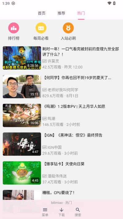 bilimiao最新版本:可以便捷查看B站在不同时间段的热门视频、音乐以及番剧等内容。