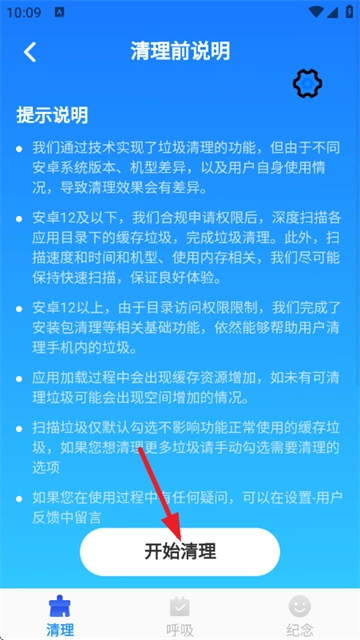 请阅读完清理前说明在点击开始清理即可。