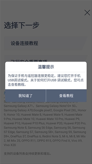 选择设备后,为确保手机和遥控器之间的连接更加稳定,您还需开启手机的USB调试功能。