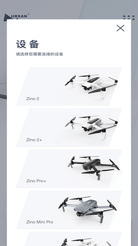成功登录账号后,在首页找到并点击“无人机”选项,接着依据您所购买的无人机具体型号,挑选与之对应的设备(当前该软件支持的设备型号有Zino 2、Zino 2+、Zino Pro+、Zino mini Pro、Zino mini SE、Zino mini、HUBSAN MINI、ACE SE和HUBSAN ACE)。