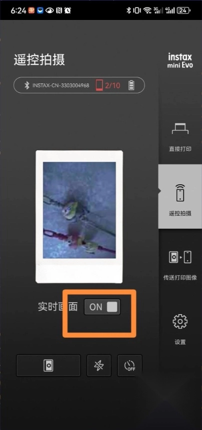 富士Mini evo也具备遥控拍摄功能。进入对应的设置页面,点击OFF按钮就能启动遥控拍摄模式。