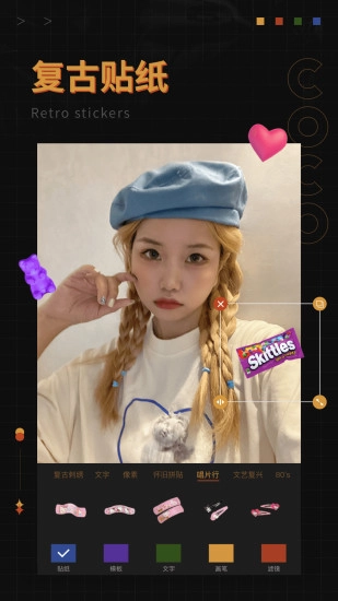 2、趣味贴纸:内含1000+款精选复古童趣风格贴纸,让照片更添趣味与创意。