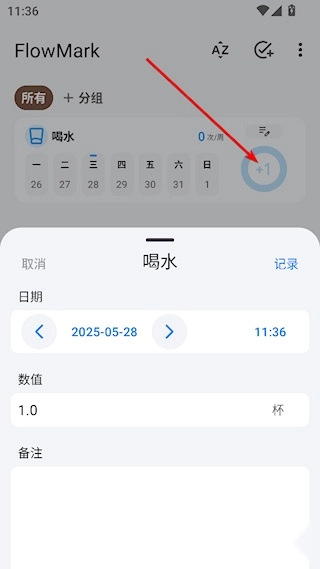 在习惯列表中,点击习惯右侧的+1,添加打卡记录