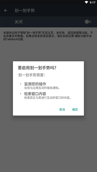 打开划一划手势的无障碍设置,并点击“确定”按钮。