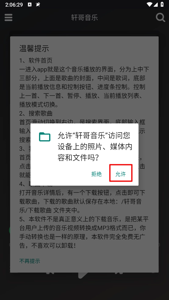 先在安装轩哥音乐,允许相关权限进行访问。