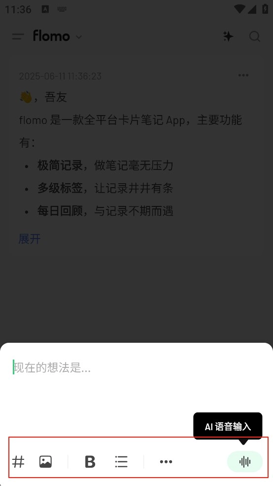 开启语音输入功能后,flomo能把语音实时转化为文字,协助我们记录下来。