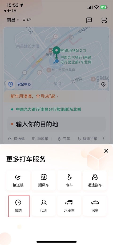在本站打开滴滴出行,登录账号后返回首页,点击下图所示位置的预约选项。