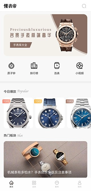 打开懂表帝后,用户在首页能够浏览原子钟、手表排行榜、选表板块,还能观看各类关于手表的小视频。