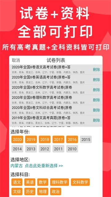 五年真题全部收录:不但收录了五年200多张高考试卷,还收录了北京、天津、浙江、上海等地的地方试卷,让你不再需要辛苦的搜索试卷就可以轻松地刷遍各地考题,在高考时更加的得心应手。