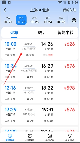 之后我们就可以查看当天所有的列车信息和对应的票价,再依据自己的实际需求挑选合适的出行时间,同时对不同车次的价格进行比较。