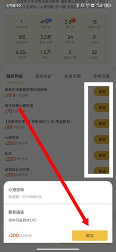 在这个界面下拉后,就能看到该医生提供的所有服务类型。我们可以根据自身需求点击购买,完成付款后即下单成功,之后只需等待医生联系我们即可。