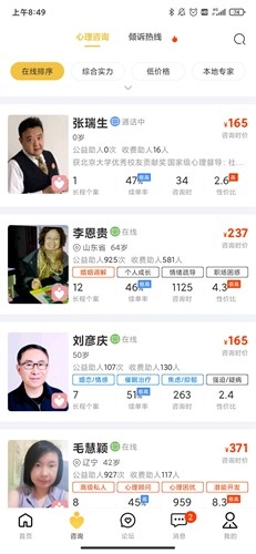 操作其实很简单,首先打开软件,接着切换到第二页的【咨询】界面。这个界面里有不少医生,不过每位医生的擅长领域各不相同。我们可以根据自身需求,筛选出擅长对应治疗方向且好评较多的医生,然后点击进入他的个人主页。