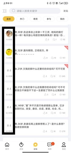 首先我们启动软件,进入【论坛】界面,在这里能看到许多其他用户发布的帖子,要是觉得彼此有相似的经历和感受,就可以点击该用户的头像进入他的个人主页。