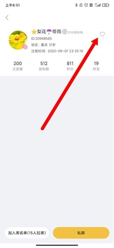 在这个个人主页上,能看到他的发帖数量、积分情况以及好友列表等信息,页面右侧还有一个爱心形状的按钮。点击这个按钮,等爱心变成红色,就意味着我们成功添加对方为好友了。