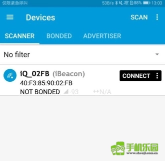 点击界面右上角的SCAN文字,即可扫描周边处于广播状态的所有蓝牙低能耗外设,这些设备会显示在SCANNER选项卡下的列表中。(如图:扫描出的低功耗蓝牙设备)