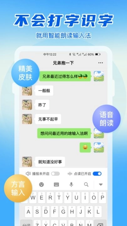 语音读字输入法——开启输入语音播报新体验 这款输入法支持用户进入首页后,根据提示完成相关设置;同时,用户也能通过软件的使用说明,快速熟悉并掌握输入法的各项功能。在聊天场景中,用户输入的文字可同步触发语音播报,既增添了互动的趣味性,也让文字输入过程拥有了全新的体验感。