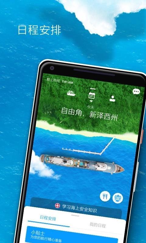 提供每日船上活动安排,涵盖演出、运动等项目的具体时间与地点,可添加至个人日历并设置提醒功能。