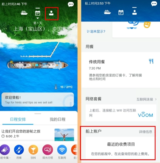 可以实时查看餐饮、购物等船上消费的详细记录,还能购买或升级酒水、网络套餐,让出行预算管理更加清晰明了。