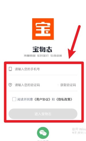 打开后,先输入您的手机号码并获取验证码,勾选协议后点击“进入宝物志”按钮即可完成登录。