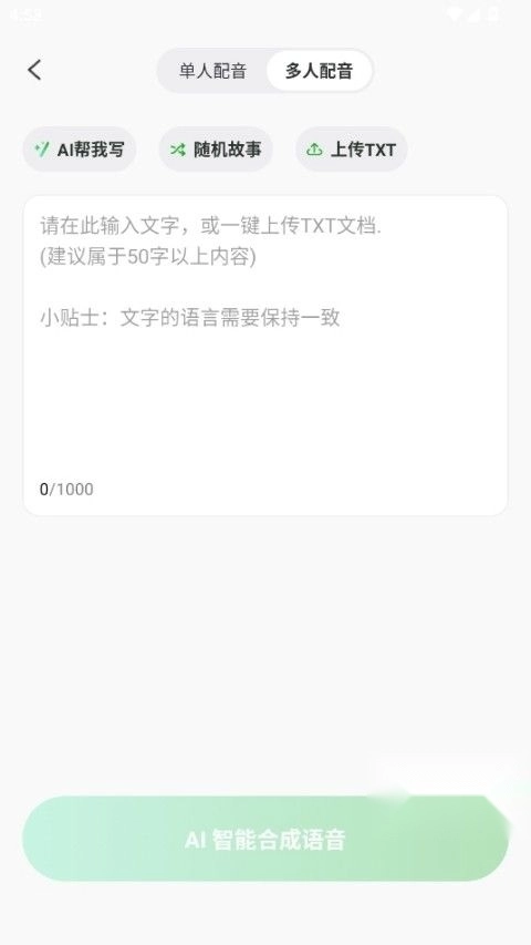 支持三种文本输入方式:AI辅助创作、随机生成故事以及上传TXT格式文件。