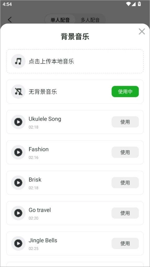 点击“背景音乐”选项,就能导入本地音乐或者使用音效库。