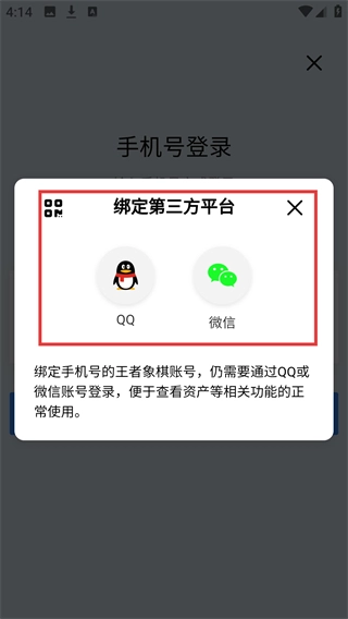 登录后会弹出【绑定第三方平台】窗口,您可以选择【QQ】或【微信】完成绑定操作,绑定后有助于确保查看资产等相关功能的正常使用。